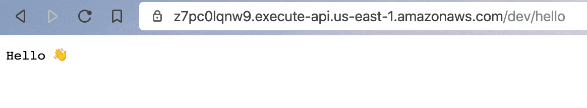You get a URL for your lambda and some debugging output. My URL is https://z7pc0lqnw9.execute-api.us-east-1.amazonaws.com/dev/hello, if you open it in your browser, it's going to say Hello π